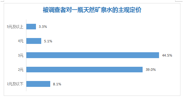 中国公众对饮用水的普遍心理预期定价在2-3元之间(一瓶约500ml)。所以,价格适中的饮用水将成为行业趋势和市场主流。